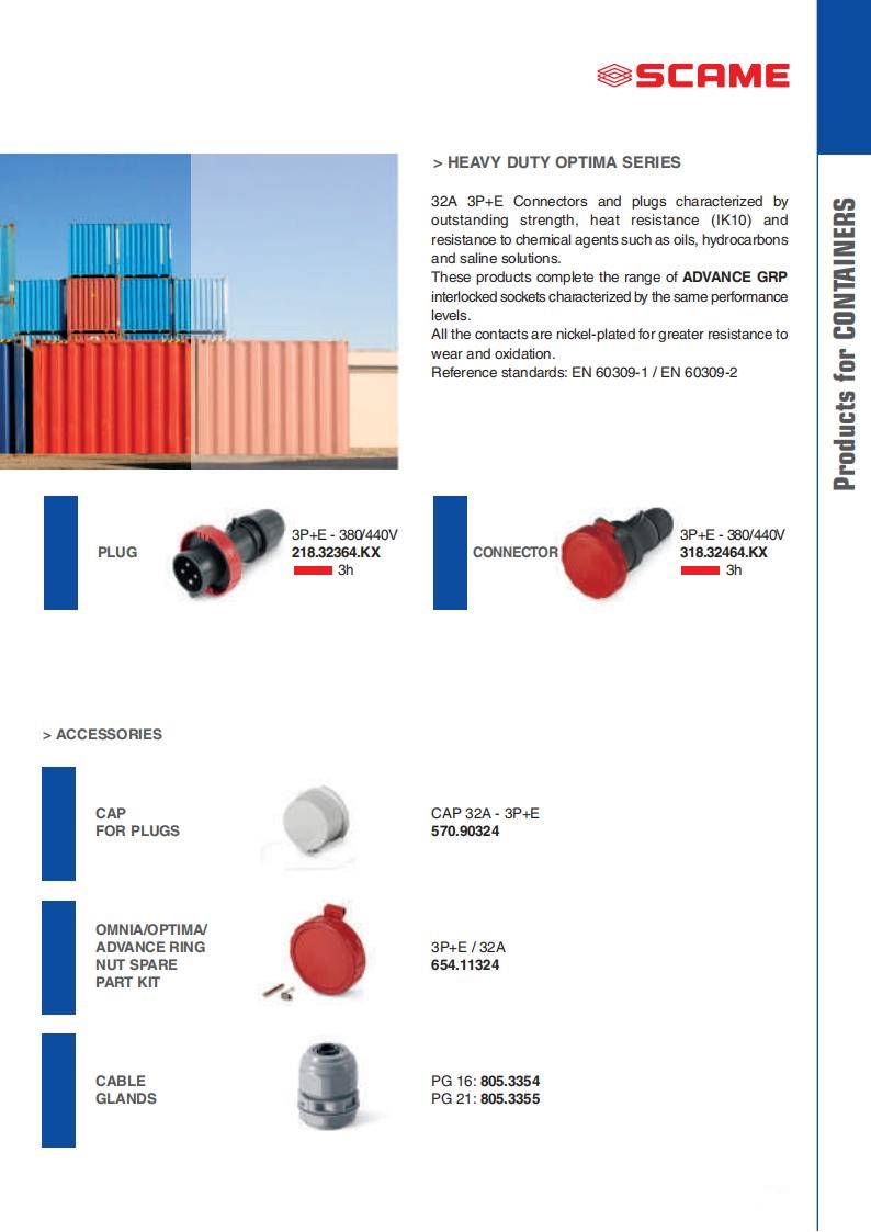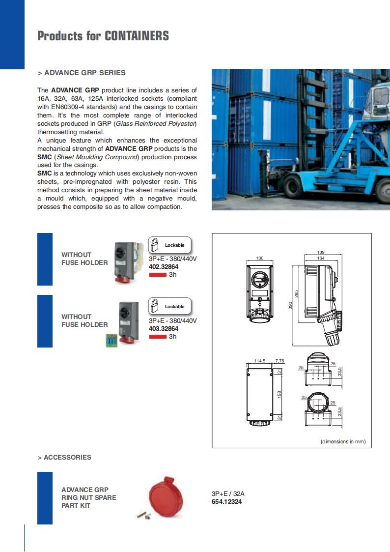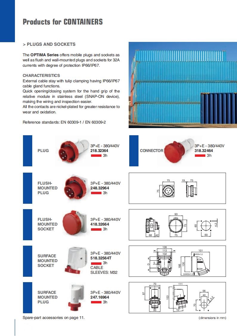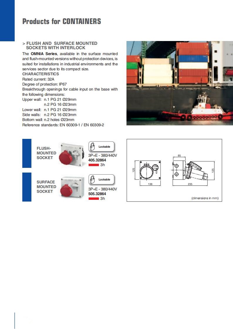 well as flush and wall-mounted plugs and sockets for 32A